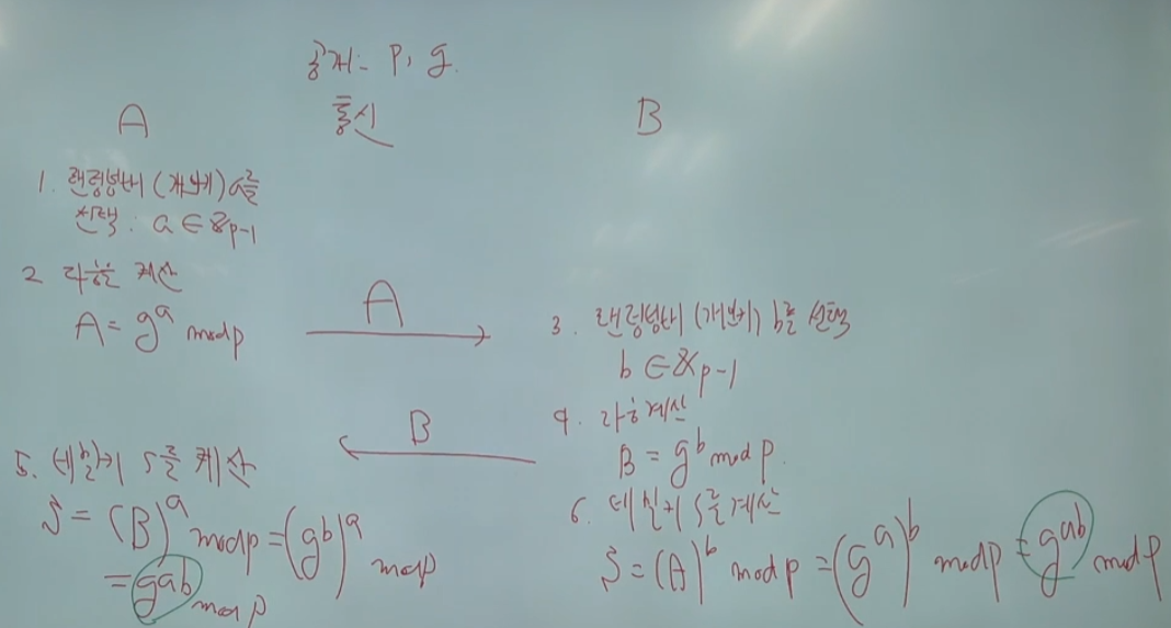 과정 (이산대수 문제 : NP 문제 => 구하기 어려운 문제다 즉, 안전하다.)