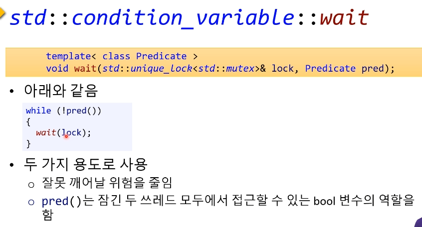 - notify_one(), notify_all() //멈춘 쓰레드 하나 또는 전부를 다시 실행