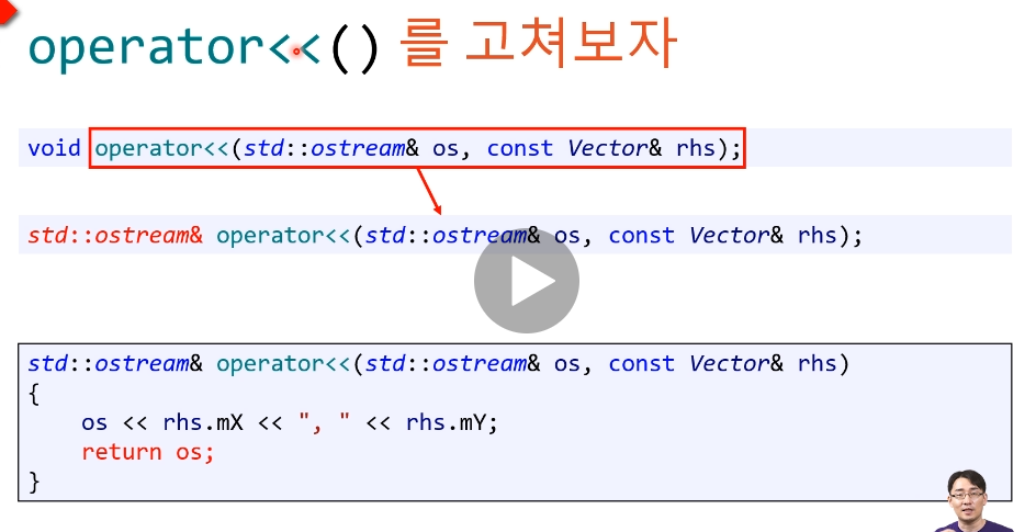 return을 이용하여 std::osteram& 형식의 os를 반환 위 방식에서 문제였던 매개변수 1번 std::ostream& os를 채움