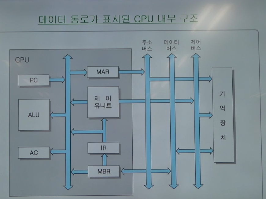 4. CPU 내부 버스 : ALU와 레지스터들 간의 데이터 이동을 위한 데이터 선과 제어 유니트로부터 발생되는 제어 신호 선들로 구성된 내부 버스, 외부 시스템 버스와 직접 연결 X, 반드시 버퍼 레지스터들 혹은 시스템 버스 인터페이스 회로를 통하여 시스템 버스와 접속