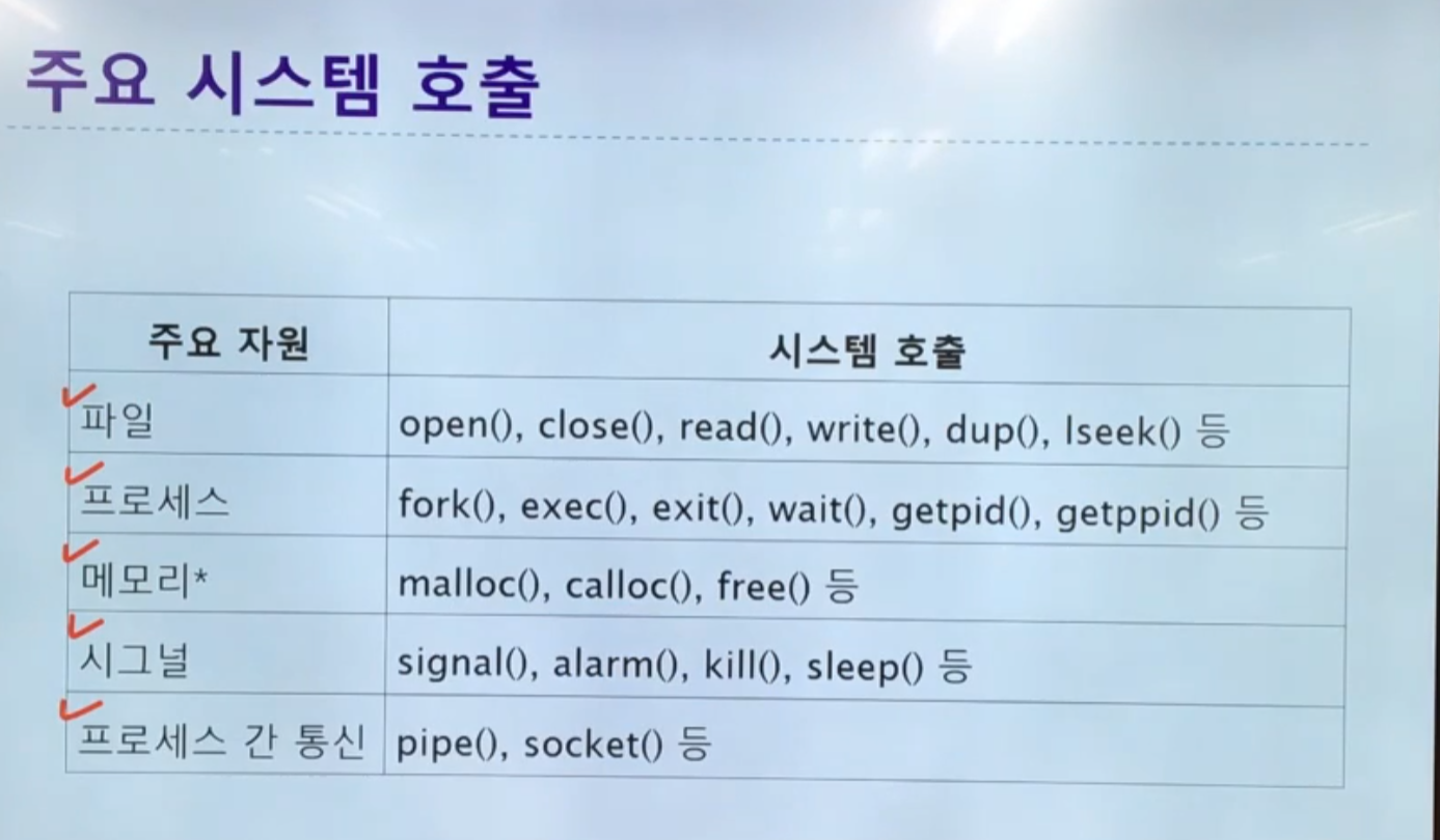 시스템 호출 : 커널에 서비스 요청을 위한 프로그래밍 인터페이스 -> API