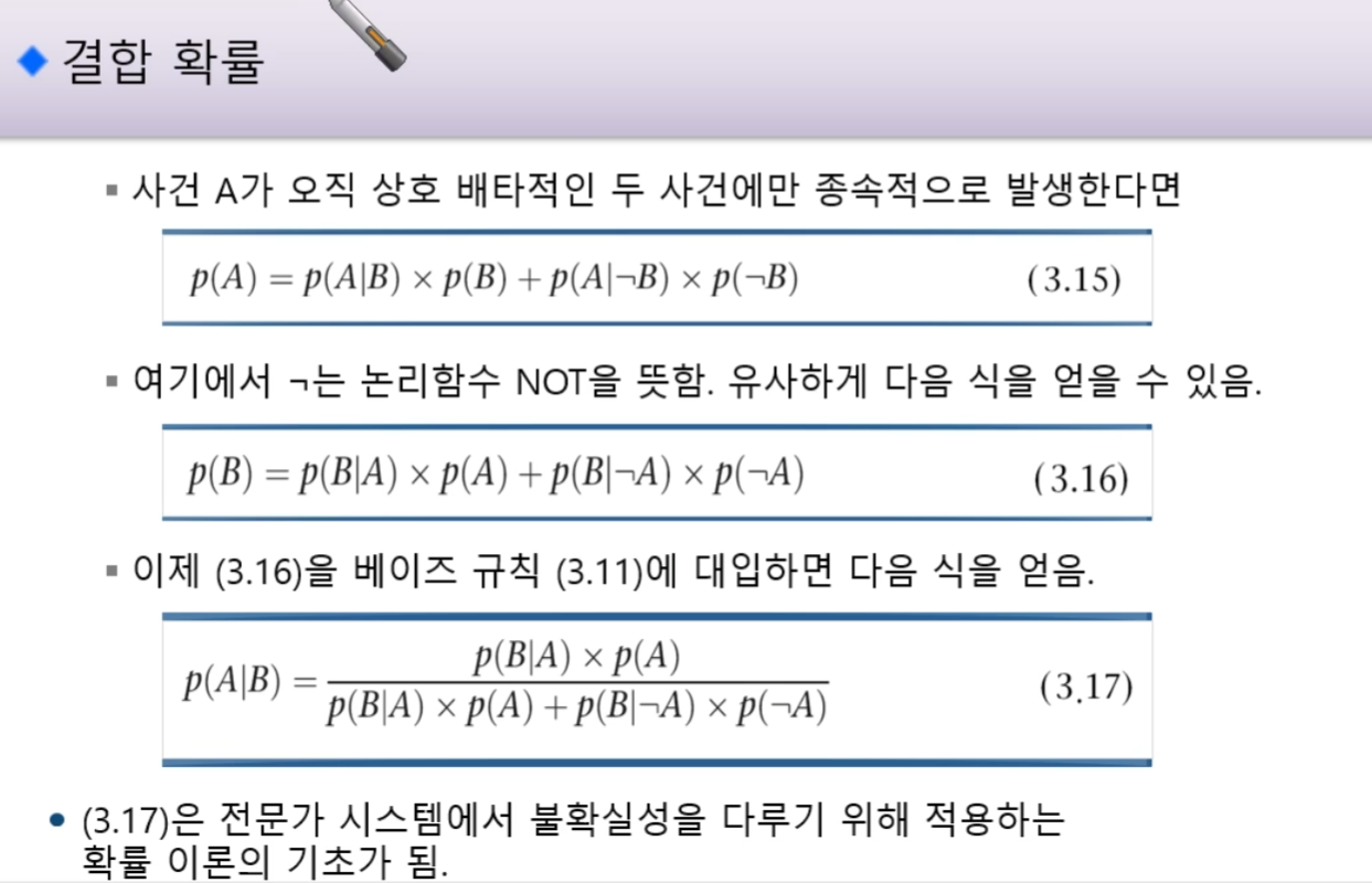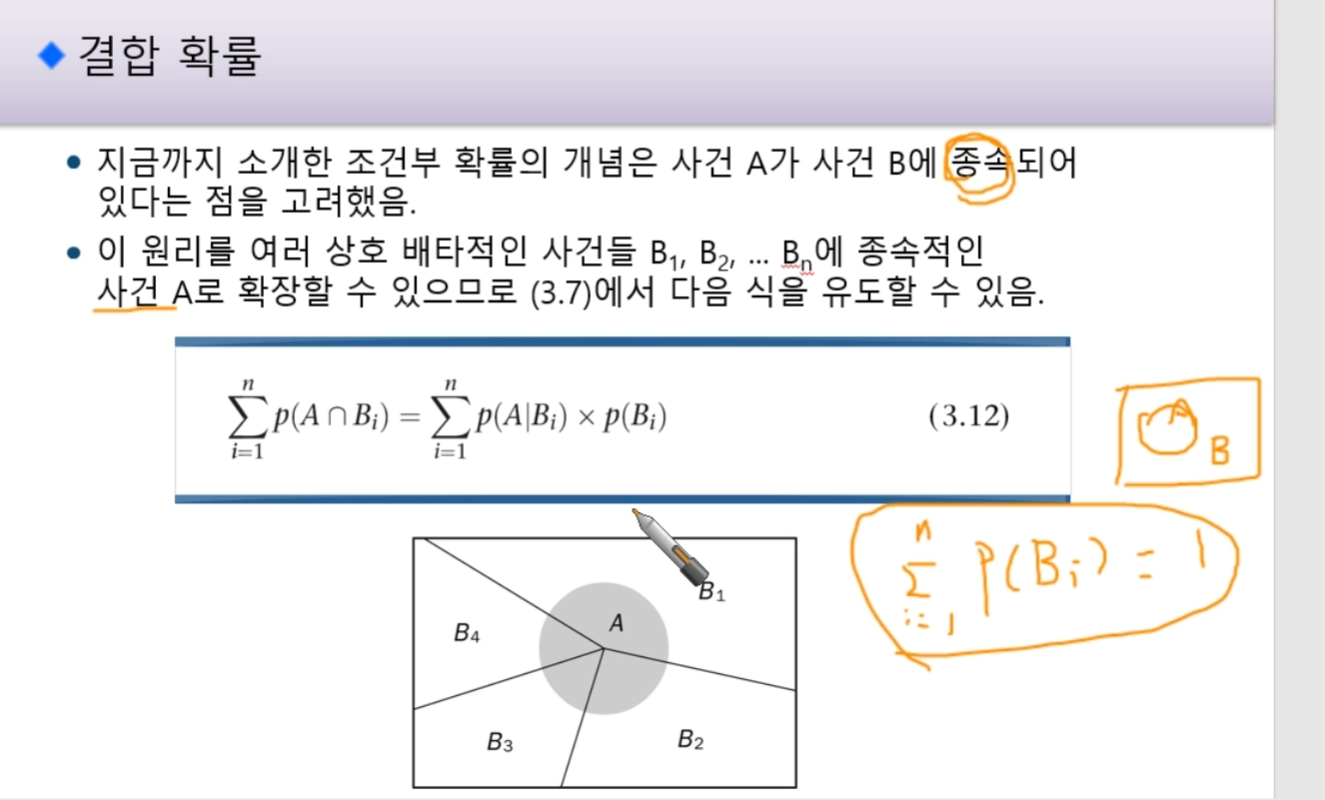 ->A, B가 상호 배타적이지 않고, 조건부로 다른 사건의 발생에 영향을 준다.