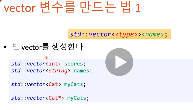 벡터는 어떤 자료형도 넣을 수 있는 동적 배열이다. (어떤 자료형? 기본 데이터, 클래스, 포인터)