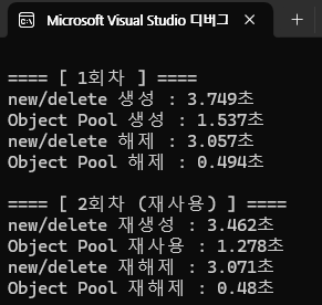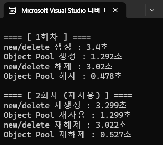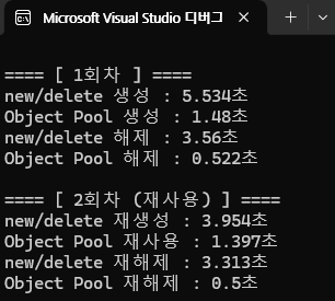 cout << "Object Pool 재사용 : " << (double)(end7 - start7) / CLOCKS_PER_SEC << "초\n";
