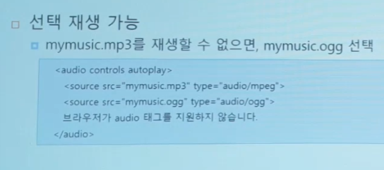 - HTML5에서는 오디오 비디오 삽입하는 표준 태그다. (플로그인 X)