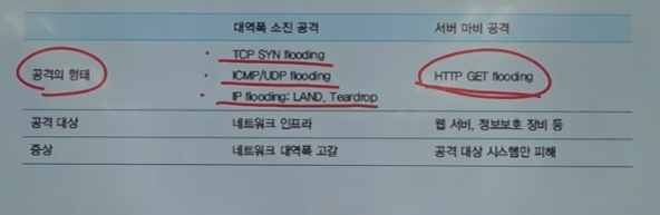 - SYN 패킷을 대량으로 보내 웹 서버의 네트워크 대역폭을 낭비하여 다른 사용자들이 일반 사용자들이 아예 웹 서버로 접속을 못하게 하는 공격 방법